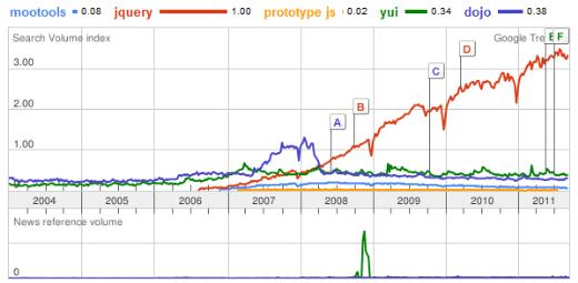 從上述圖我們可以看到j(luò)query遠(yuǎn)遠(yuǎn)領(lǐng)先于其他的js框架,排名第二的低了3個(gè)點(diǎn),形成了一邊倒的趨勢,老牌的js框架prototype由于使用困難和體積臃腫的原因一直使用率很低,而mootools本來一直以黑馬姿勢殺出,號(hào)稱輕量級(jí)并且速度快,但是由于jquery本身不俗的功力和眾多的插件,mootools也只能埋沒在jquery的光輝下面了。